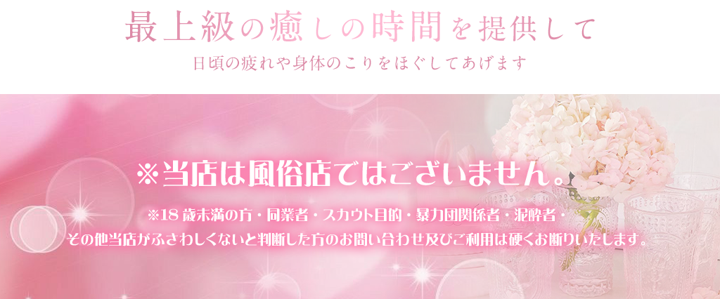 他のお客様に気を使う事なくゆったりとした空間の中でセラピストによるマッサージ、アロママッサージであなたの心と体に「完全な癒し」を貴方に提供できることをお約束いたします。セラピストも『可愛い・きれい』とお客様からも声をかけていただける美女セラピストが揃っております。